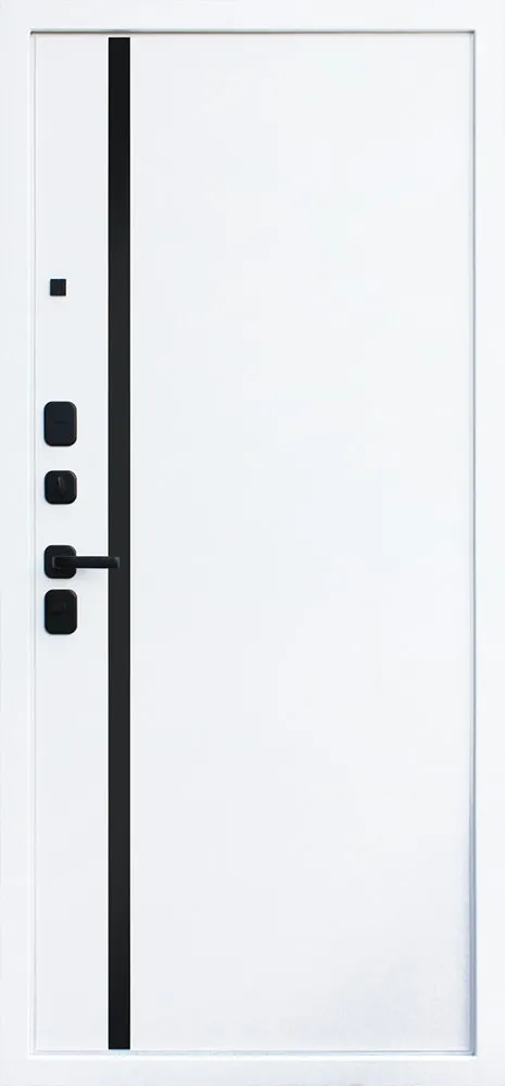 Порошковое покрытие "муар белый". Экошпонированная панель МДФ 10 мм (дизайн ФЛС). Цвет "белый матовый". Вертикальная вставка из черного глянцевого лакобеля. Объемная фрезеровка. Наличник гладкий, МДФ 80 мм.